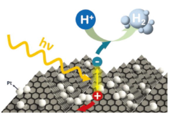 Figure 1. 基于3D金字塔狀石墨烯/p-Si肖特基結的PEC電池產生H2的示意圖。