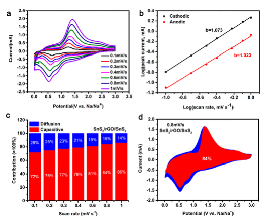 Figure 6. 鈉儲(chǔ)存行為的定量電容分析。(a)不同掃面速度下的CV曲線;(b)對(duì)數(shù)陰極/陽(yáng)極峰值電流與對(duì)數(shù)掃描速率之間的關(guān)系;(c)不同掃描速率下電容容量的整體貢獻(xiàn)率;(d)0.8 mV s