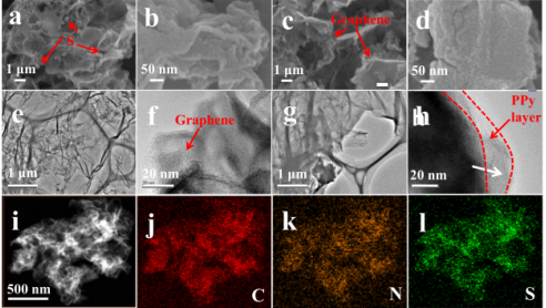 Figure 2. (a,b) S@GA和(c,d) PPy@S@GA不同放大倍數(shù)的SEM圖;(e,f) S@GA和(g,h) PPy@S@GA不同放大倍數(shù)的TEM和HRTEM圖;(i) PPy@S@GA復合材料單個粒子的STEM 圖,以及(j)碳、(k)氮和(l)硫的元素映射。
