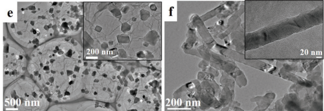 Figure 2. 所制備的Al@GNs的(a)SEM、(b)TEM(插圖:HRTEM圖像)和(c)STEM圖像;(d)Al@GNs的掃描TEM圖像和相應碳(C)和鋁(Al)的元素映射圖像;(e)在氬氣下合成的Al@GNs的代表性TEM圖像和f)在與Al@GNs相同的條件下合成但不存在石墨烯的鋁納米纖維(插圖:單一納米纖維的放大圖像)。