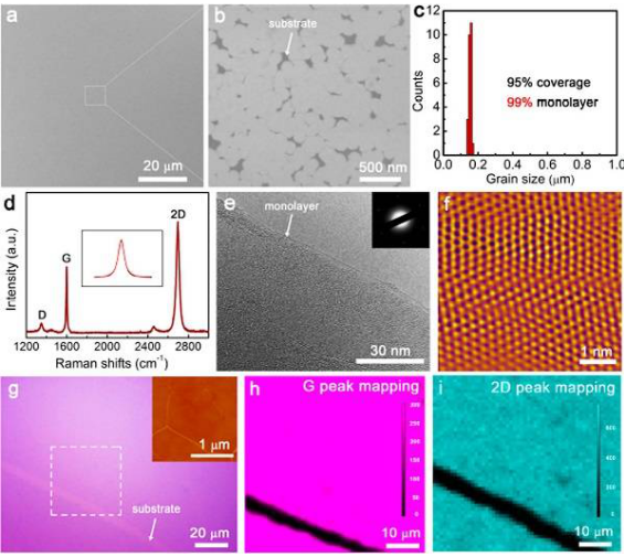 Figure 3. (a,b)均勻石墨烯薄膜的SEM圖。(c)圖b中石墨烯顆粒的粒徑直方圖。(d)石墨烯薄膜的拉曼光譜。(e)單層石墨烯薄膜邊緣的TEM圖。(f)單層石墨烯薄膜的過濾原子分辨橫向力圖像。(g-i)圖g中的標記區域的光學圖像、相應的拉曼G峰和2D峰強度映射。