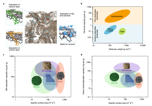 Figure 2. 3DM用于從水中去除污染物:a,研究3DM以去除各種污染物;b,文獻(xiàn)數(shù)據(jù)分析表明,GO 3DMs對(duì)碳?xì)浠衔锏娜コ芰Ω哂诮饘俸腿玖希籧,將GO海綿的MB吸附容量與其他類型的碳基3DM進(jìn)行比較;d,與c類似,將GO海綿的重金屬吸附能力與其他類型的碳基3DM進(jìn)行比較。