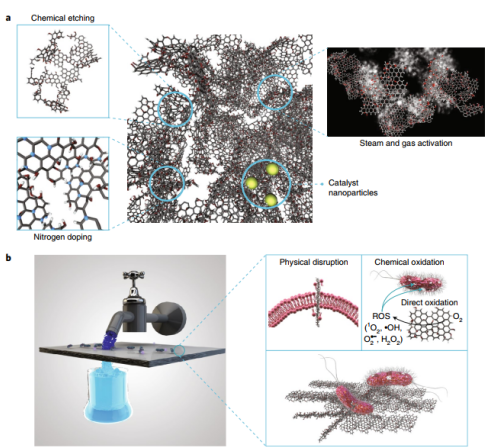 2捕獲性能;b,基于石墨烯的納米片通過(guò)物理和化學(xué)機(jī)制具有抗微生物特性。