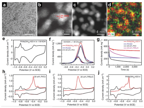 2/rGO-4在1M甲醇/1 M KOH中短期耐久性測量;(h)商業20wt%Pt/C、(i)市售20wt%PtRu/C和(j)Pt/Ni(OH)
