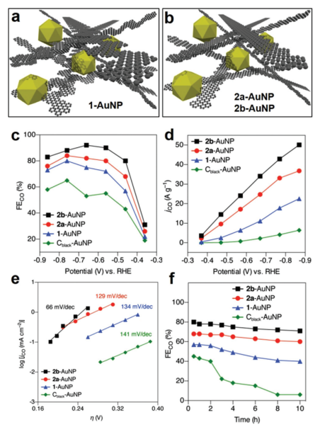 Figure 7. (a)1-AuNP和(b)2-AuNP納米復合材料的示意圖;1-AuNP(藍色三角形)、2a-AuNP(紅色圓圈)、2b-AuNP(黑色方塊)和炭黑-AuNP(綠色菱形)復合電極產生CO的(c)法拉第效率、(d)電流、(e)塔菲爾斜率和(f)穩定性。