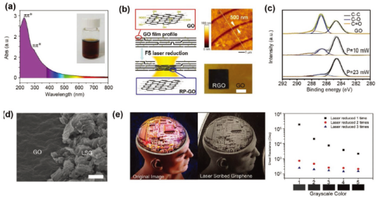 Figure 2.激光還原GO。(a)GO吸收譜,(b)激光誘導光化學還原GO示意圖,(c)GO 和 LRGO 的C1s XPS 譜,(d)GO 和 LRGO 的SEM圖,(e)LRGO電阻調控。