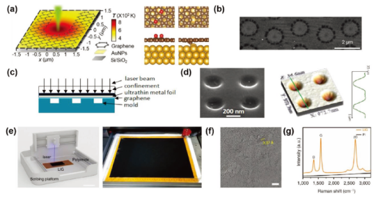 Figure 3. CVD石墨烯的激光處理和激光誘導的石墨烯。(a)激光切除石墨烯示意圖和石墨烯氧化的DFT模型,(b)石墨烯皺褶,(c)激光沖擊石墨烯和(d)相應的SEM 和 AFM圖,(e)激光誘導的石墨烯,(f)LIG的HRTEM圖,(g)LIG的Raman譜。