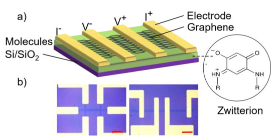 Figure 1. 樣品設計:(a)石墨烯-分子層裝置,(b)傳統裝置的光學照片。