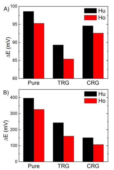 Figure 3. 由峰-峰分離值(ΔE)表示異質電子轉移。使用一對氧化還原探針:(A)[Ru(NH3)6]2+/3+和(B)[Fe(CN)6]3-/4-。