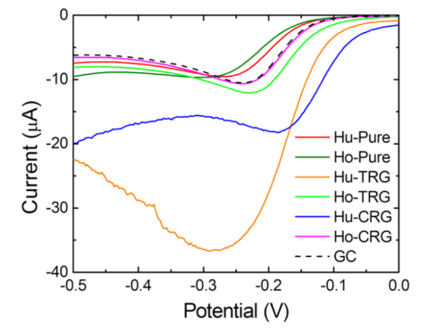 Figure 4. 在空氣飽和的0.5 M KOH溶液中測試氧還原反應。