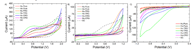 Figure 5. 在50 mM PBS(pH:7.2)中的(a)5 mM肼、(b)5 mM NaHS和(c)5 mM過氧化氫異丙苯存在下記錄的循環伏安圖。