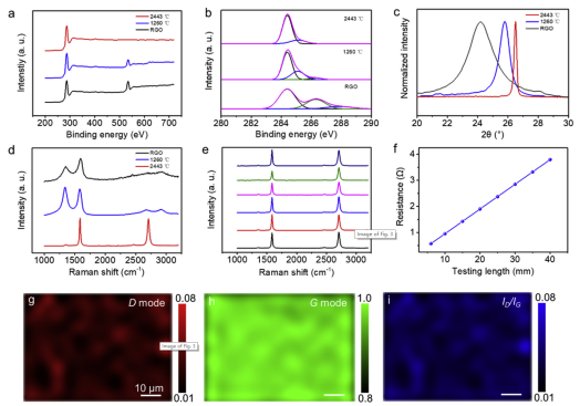 Figure 3.不同電熱溫度熱處理石墨烯膜的(a,b)XPS、(c)XRD、(d)Raman表征;(e)石墨烯膜不同位置的拉曼光譜,間隔距離為1cm;(f)石墨烯膜電阻與測試長度的關系,表明制備的石墨烯膜宏觀尺寸均勻;(g-i)石墨烯膜的拉曼成像掃描,證明石墨烯膜微觀尺寸結構均勻。