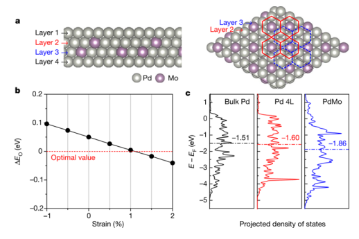 Fig. 3:DFT計(jì)算氧吸附能和d帶中心。(a)左邊:四層PdMo雙金屬烯原子模型的側(cè)視圖。右邊:原子模型的俯視圖。(b)PdMo雙金屬烯的?EO為壓縮(負(fù))和拉伸(正)應(yīng)變的函數(shù)。水平紅線表示最優(yōu)?EO值。(c)在體鈀、四層鈀板(Pd 4L)和PdMo中,表面鈀原子的d帶電子密度的預(yù)測。水平虛線表示計(jì)算出的d波段中心。