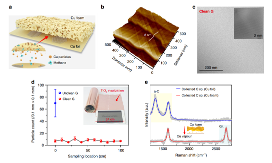 Figure 2. (a)實驗設(shè)計的示意圖;插圖:銅箔和泡沫之間的間隙中銅與甲烷的相互作用;(b)生長后在銅箔上新鮮制備的清潔石墨烯的AFM圖像;(c)超清潔石墨烯膜的TEM圖像;插圖:石墨烯的HRTEM圖像;(d)吸附在超潔凈石墨烯和不潔凈石墨烯上不同位置的TiO2顆粒數(shù)量,誤差線代表相對偏差;插圖:TiO2可視化后的米級超潔凈石墨烯的照片;(e)在有(紅色線)和沒有(藍色線)Cu泡沫的輔助下,在CVD長期間在邊界層中收集的Cu納米顆粒上的碳納米顆粒(C sp。)的拉曼光譜;黃色和藍色矩形分別代表無定形碳和石墨烯相關(guān)的拉曼峰。