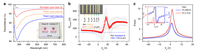 Figure 4. 超清潔石墨烯的光電性能:(a)石英襯底上單層、雙層和三層超凈石墨烯薄膜的紫外可見光譜;插圖:將大面積超清潔石墨烯和不清潔石墨烯轉(zhuǎn)移到PET基材上的照片,iPad用作尺寸參考;(b)測得的接觸電阻與柵極電壓的關(guān)系;(c)石墨烯電阻隨柵極電壓(Vg)變化的典型曲線圖;插圖:在1.9 K下,磁場強度為5 T時,超潔凈石墨烯的縱貫(Rxx,紅線)和霍爾電阻(Rxy,藍線)。
