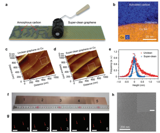 Figure 1. 超凈石墨烯經活性碳涂層皮棉輥處理:a)涂有活性炭的皮棉輥用于清潔石墨烯表面的示意圖;b)活性炭和石墨烯之間接觸面的截面EDS圖;銅箔上c)不清潔和d)超清潔石墨烯的AFM圖像;e)不清潔石墨烯和超清潔石墨烯高度分布的直方圖分別對應于(c)和(d)中的虛線框;f,g)通過選擇性沉積TiO2顆粒(g中的白點)大面積觀察獲得的超凈石墨烯;比例尺:50 µm;h)清潔表面的HR-TEM圖像;插圖:超凈石墨烯的晶格圖像;比例尺:2 nm。