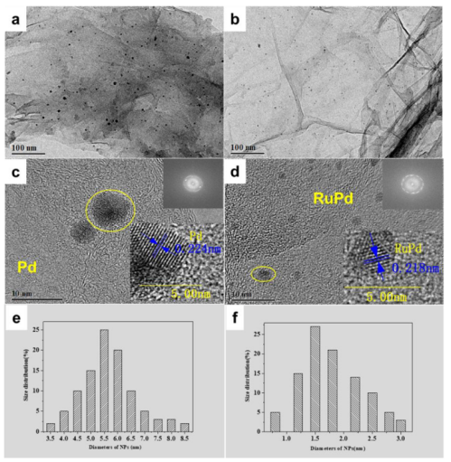 Figure 2. (a,c,e)單金屬2Pd/RGO催化劑和(b,d,f)1Ru1Pd/RGO催化劑的HRTEM和粒度分布直方圖。