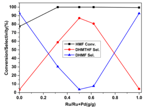 Figure 3. RuPd/RGO催化劑中Ru/(Ru+Pd)質量比對DHMTHF和DHMF選擇性的影響。