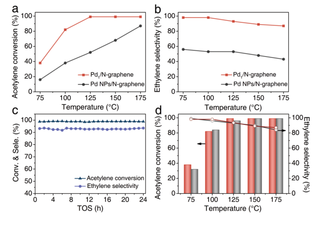 1/N-石墨烯和Pd NPs/N-石墨烯催化劑,乙烯選擇性隨反應溫度的變化而變化;c)Pd