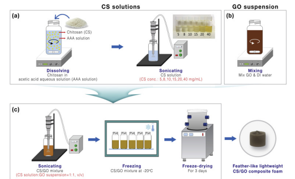 Fig. 1. CS/GO泡沫的合成過程示意圖:制備(a) CS溶液和(b) GO懸浮液,(c)制備 CS/GO混合物并冷凍干燥產(chǎn)生的CS/GO泡沫。