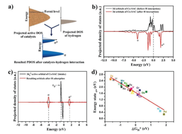 Figure 2. 單原子催化劑的電子結(jié)構(gòu)及其活性關(guān)系:a)催化劑活性位點(diǎn)與氫的軌道雜交方案(σ=鍵,σ*=反鍵態(tài)軌道);b)Co-SAC氫相互作用前后3d雜化軌道的預(yù)計(jì)DOS;c)Co-SAC的3dz2活躍軌道(Ep,向上旋轉(zhuǎn)和向下旋轉(zhuǎn))的PDOS與氫相互作用產(chǎn)生σ和σ*軌道;d)吉布斯自由能(ΔGH*)與反鍵態(tài),費(fèi)米能級上的Eσ*之間的相關(guān)性源自單原子催化劑的活性價(jià)dz2軌道與氫原子的相互作用。