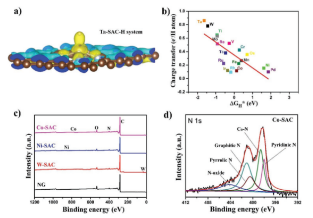 Figure 3. 單原子催化劑的電荷轉(zhuǎn)移和化學(xué)組成:a)反應(yīng)期間從Ta-SAC到氫的電荷轉(zhuǎn)移;b)電荷轉(zhuǎn)移與HER活性(吉布斯自由能)之間的關(guān)系;c)Co、Ni和W單原子催化劑與氮摻雜石墨烯(NG)的XPS光譜;d)鈷單原子(Co-SAC)的N 1s反褶積光譜。