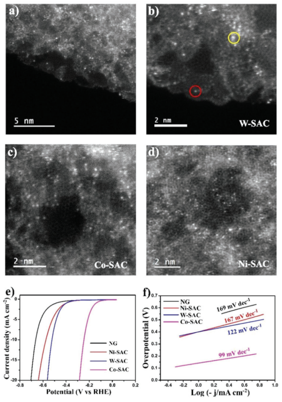 Figure 4. STEM和電化學(xué)表征:a)ADF-STEM圖像表明孤立的鎢單原子均勻分布在整個(gè)石墨烯表面;b–d)W-SAC、Co-SAC和Ni-SAC在更高放大倍數(shù)下的STEM圖像;e)在0.5 M H2SO4中,10 mV/s的掃描速率下對HER的線性掃描伏安曲線;f)相應(yīng)的Tafel圖。