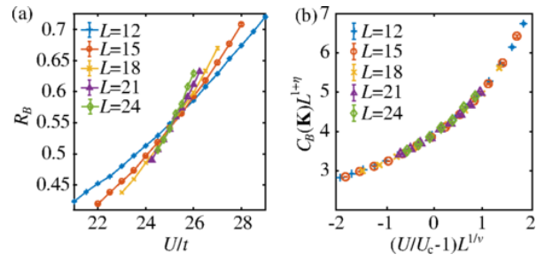 FIG. 2. 結(jié)構(gòu)因子CB(K)在t2/t=0作為U/t的函數(shù)時的(a)鍵-鍵的相關(guān)比RB和(b)臨界數(shù)據(jù)分析。