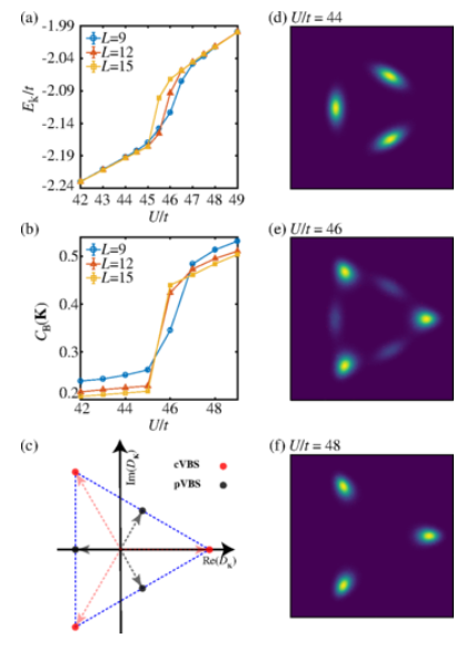 FIG. 4. (a)在大的U值下,系統(tǒng)的每個位置的動能。(b) CB(K)對于相同的過程,VBS順序也發(fā)生了跳躍,表明這是不同VBS相之間的轉(zhuǎn)變。(c)復(fù)序參數(shù)DK的角度相關(guān)性。(d)-(e)不同交互強(qiáng)度下DK的直方圖U<UVBS, U≈UVBS, U>UVBS。