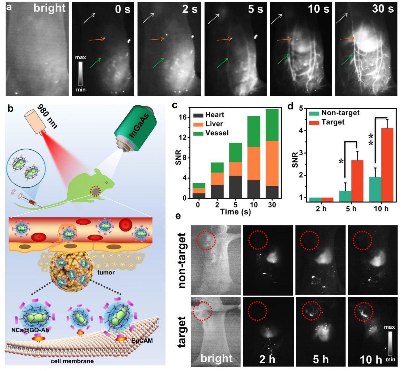 圖2 a)小鼠經(jīng)尾靜脈注射NCs@GO-PEG后的NIR-II成像圖;b)腫瘤靶向NIR-II成像示意圖;c)小鼠心臟、肝臟、血管處的NIR-II信號強(qiáng)度變化圖;d)腫瘤區(qū)域的NIR-II成像信噪比變化圖;e)小鼠NIR-II熒光成像圖。