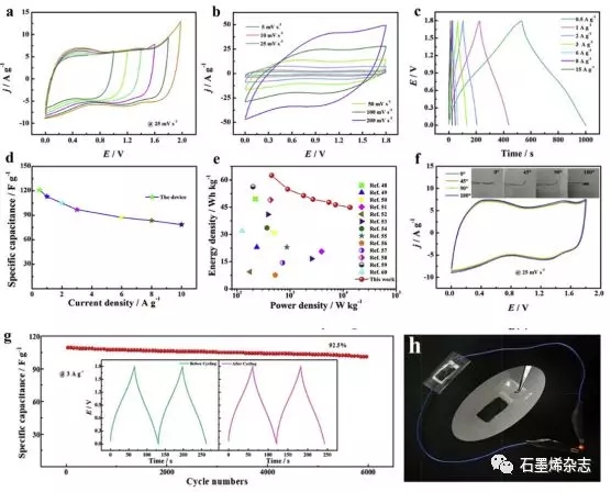 Figure 4. NiFe2O4@rGO FSSC的電化學(xué)性能:(a)不同電位窗口的CV曲線;(b)不同掃描速率的CV曲線;(c)各種電流密度下的GCD曲線;(d)比電容作為電流密度的函數(shù);(e)NiFe2O4@rGO FSSC的Ragone圖,并與之前的文獻(xiàn)進(jìn)行比較;(f)機(jī)械彎曲對CV曲線的影響;(g)循環(huán)穩(wěn)定6000個(gè)循環(huán),插圖:完成6000次循環(huán)之前和之后的GCD曲線;(h)由單個(gè)NiFe2O4@rGO FSSC供電紅色LED的數(shù)字照片。