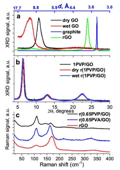 Figure 1. (a)石墨、干/濕GO、rGO薄膜的XRD比較。(b)由1PVP/GO (MW = 3.5 kDa)制備的復合膜的XRD圖。(c)不同復合膜rGO 、r(0.65 PVA/GO)、r(0.65 PVP/GO)的拉曼光譜。