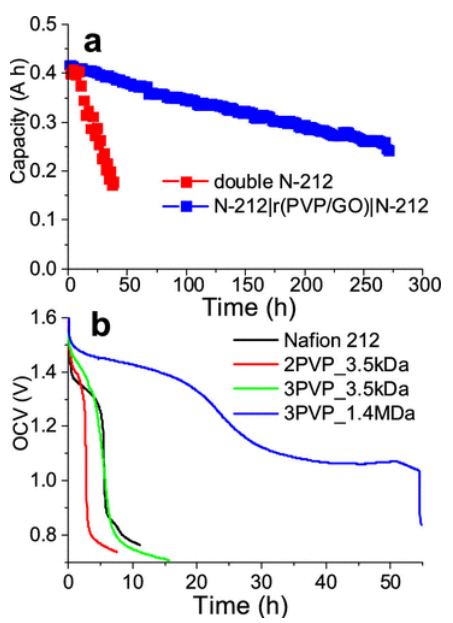 4的30 mLVFB電池容量隨時間的變化有兩種配置:兩個N212膜和夾在兩個N212膜之間的r(PVP/GO)膜。(b)充電釩電池(1.5 M V in 3m H