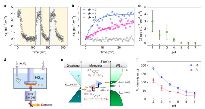控制額外的載流子是操縱各種二維材料電子、光學(xué)和磁性的關(guān)鍵。然而,二維材料在空氣和酸中普遍存在的空穴摻雜在其力學(xué)細(xì)節(jié)上一直存在爭(zhēng)議。在這里,我們證明了它們的共同起源是由氧和水分子的氧化還原對(duì)驅(qū)動(dòng)的電化學(xué)反應(yīng)。使用WS