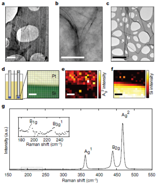 Figure 3. PNR形成機理和Raman光譜。(a-c)TEM圖顯示了納米帶的形成過程,(d)電沉積示意圖,Pt涂覆-Si/SiO2為工作電極和對電極,Pt線為參比電極,(e-f)磷烯Ag2和硅峰強度,(g)PNRs樣品拉曼光譜。