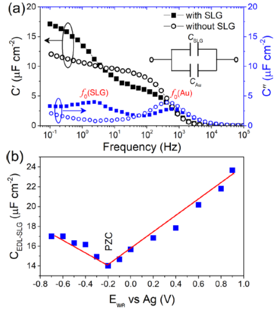 Figure 2.(a)有/無SLG涂覆的電極電容實部與虛部,在EMITFSI電解液中,施加電壓為0.2 V (相對于ref),插圖呈現了相應的等效電路圖,(b)Au涂覆石英共振器支撐SLG的CEDL?SLG−Ewe曲線。