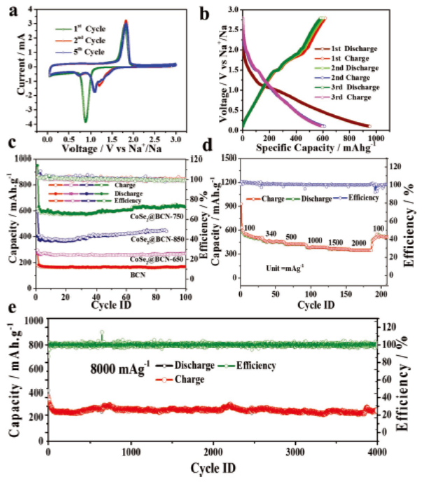 Figure 4. CoSe2@BCN-750用于SIBs的電化學性能表征。(a)CV曲線,(b)充放電曲線,(c)循環性能比較,(d)不同電流密度下的倍率性能,(e)在大電流密度下的長期循環穩定性。