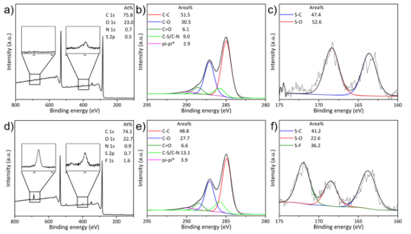 Figure 2. (a, d) XPS測量光譜與放大的F1s(左插圖)和N1s峰(右插圖),GO(頂行)和GO 1(底行)高分辨率的(b, e) C1s和(c, f) S2p光譜。