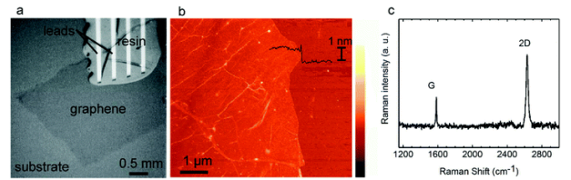 Fig. 1 轉(zhuǎn)移石墨烯單層的表征。(a)石墨烯片的光學(xué)顯微照片。(b)包含高度剖面的石墨烯薄片AFM圖。(c)轉(zhuǎn)移后在石墨烯處測(cè)得的拉曼光譜。