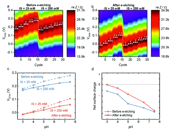 2上石墨烯的表面電荷分布。(a), (b) 隨pH(狄拉克點(diǎn)以白色表示)和離子強(qiáng)度(IS)的變化而變化的電阻(re.Z)。(c)從a和b提取的狄拉克點(diǎn)隨pH的變化。(d)通過(guò)從25 mM的VDirac(c的虛線)中減去250 mM的VDirac(c的實(shí)線)對(duì)GLI的凈表面電荷作為pH的定性估計(jì)。