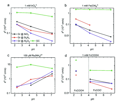 基于單個(gè)石墨烯單層的電化學(xué)器件通常是在固體載體如氧化硅、玻碳或金屬薄膜上實(shí)現(xiàn)的。在這里,我們表明絕緣襯底上的石墨烯在不依賴于質(zhì)子的電極反應(yīng)中,具有各種氧化還原活性分子的石墨烯上的電子轉(zhuǎn)移動(dòng)力學(xué)由溶液pH值決定。我們認(rèn)為該異常現(xiàn)象的起因主要是由于溶解/解離的氧化還原物質(zhì)之間的靜電效應(yīng),以及負(fù)載石墨烯-液體界面上痕量的可電離基團(tuán)而引起的界面電荷。陽(yáng)離子氧化還原物質(zhì)在堿性pH下顯示出較高的電子轉(zhuǎn)移速率,而陰離子物質(zhì)在酸性pH下有更快的電子轉(zhuǎn)移。盡管在三種不同的絕緣襯底上的石墨烯上觀察到這種行為,但這種效應(yīng)的強(qiáng)度似乎取決于襯底的表面電荷密度。這一發(fā)現(xiàn)對(duì)設(shè)計(jì)基于石墨烯單分子層的電化學(xué)傳感器和電催化劑具有重要意義。