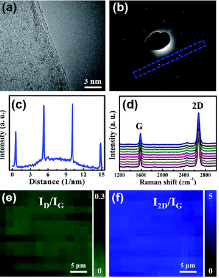 Fig. 3 (a)單晶石墨烯薄膜HRTEM圖。(b)從單晶石墨烯薄膜的隨機(jī)區(qū)域中保存的圖形。(c)沿b圖中線的衍射點(diǎn)強(qiáng)度。(d)來自10個(gè)隨機(jī)位置的拉曼光譜和(e,f)單晶石墨烯膜的D/G和2D/G峰強(qiáng)度比的拉曼映射圖。