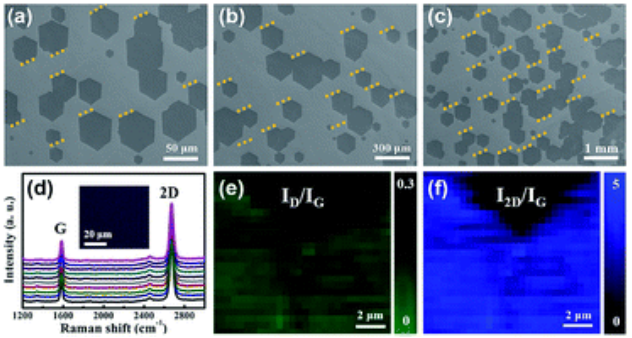 4在不同持續(xù)時(shí)間下單晶石墨烯生長(zhǎng)的SEM圖:(a) 3 min, (b) 5 min和(c) 7 min。(d)來自10個(gè)隨機(jī)位置的拉曼光譜和(e,f)縫合的單晶石墨烯薄膜的D/G和2D/G峰值強(qiáng)度比的拉曼映射圖像。