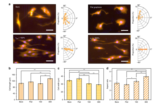 Fig. 2:在各向異性皺褶石墨烯平臺上接種3天后,單細胞水平的C2C12細胞的形態(tài)。(a)裸(無石墨烯)、平(有石墨烯)、150%和300%預加壓皺石墨烯平臺上C2C12細胞的免疫熒光圖像。C2C12細胞播種后3天形態(tài)學分析:(b)細胞長度,(c)細胞寬度,(d)長寬比。