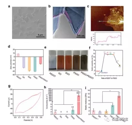 Figure 2 PSGO-PEDOT納米片的表征。PSGO-PEDOT納米片的a) SEM、 b) TEM圖和c) AFM圖。d)不同納米片的Zeta電位。e)不同納米片在水中24小時后的分散性。f)不同質量比E的DOT/PSGO納米片的固溶性。g) PSGO-PEDOT納米片的CV曲線,掃描速度為5 mV s
