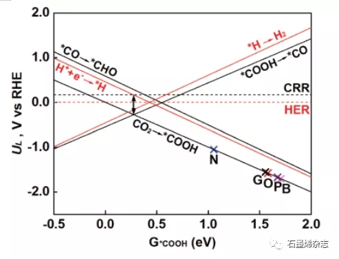 Figure 4. CRR重要步驟(黑實線)和HER兩個重要步驟(紅實線)的極限電壓與*COOH結合自由能的函數關系。