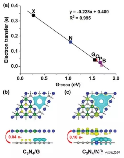 Figure 5.(a)電子轉移與*COOH結合自由能的關系,(b)C3N4/G 和(c)C3N4/NG中的界面電子轉移情況。