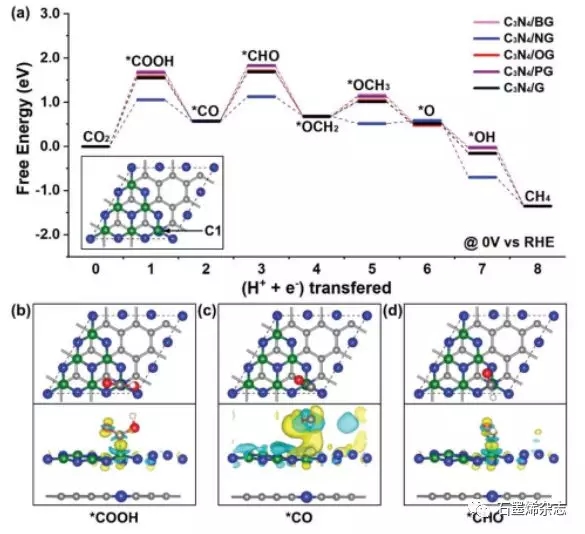 Figure 1. (a)不同雜化催化劑用于CO2還原生成CH4過程的自由能圖,(b-d)碳鍵合中間產物(分別是*COOH, *CO, *CHO)的最優幾何結構以及電子轉移過程。