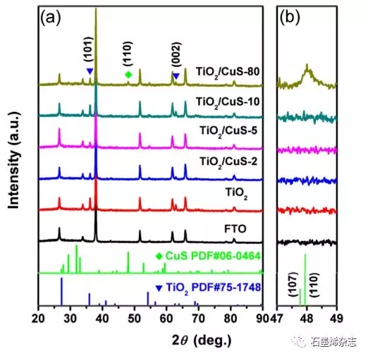 2/CuS-x(x = 0、2、5、10和80)納米線(xiàn)陣列異質(zhì)結(jié)構(gòu)的XRD圖譜;(b)部分放大的XRD圖案。