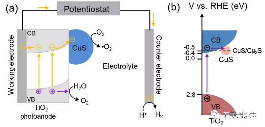 2/CuS異質(zhì)結(jié)光電陽(yáng)極的(a)PEC反應(yīng)機(jī)理和(b)能帶結(jié)構(gòu)圖的示意圖。